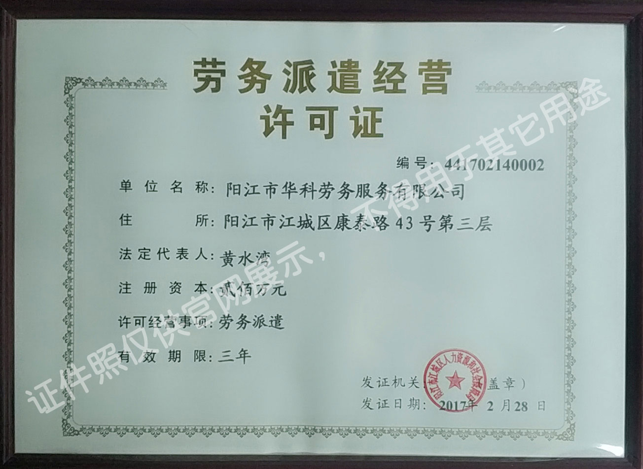 陽江市華科勞務(wù)服務(wù)有限公司是專業(yè)從事勞務(wù)外包、人事代理、勞務(wù)租賃、人力派遣及管理的綜合性服務(wù)機(jī)構(gòu),是首批獲得廣東省人力資源廳、陽江市勞動(dòng)和社會(huì)保障局頒發(fā)人力資源許可證的合法單位?!罢\(chéng)信務(wù)實(shí)、專業(yè)熱情、滿意第一、服務(wù)社群”的經(jīng)營(yíng)理念,在勞務(wù)派遣業(yè)務(wù)的基礎(chǔ)上,更致力于合同制工人(臨時(shí)工、實(shí)習(xí)生、假期工)方向發(fā)展,為用工企業(yè)及時(shí)輸送合格的各類人才,合理調(diào)配人力資源的有序流動(dòng),幫助求職者尋求更加滿意的就業(yè)渠道和崗位,切實(shí)維護(hù)求職者的合法權(quán)益。
